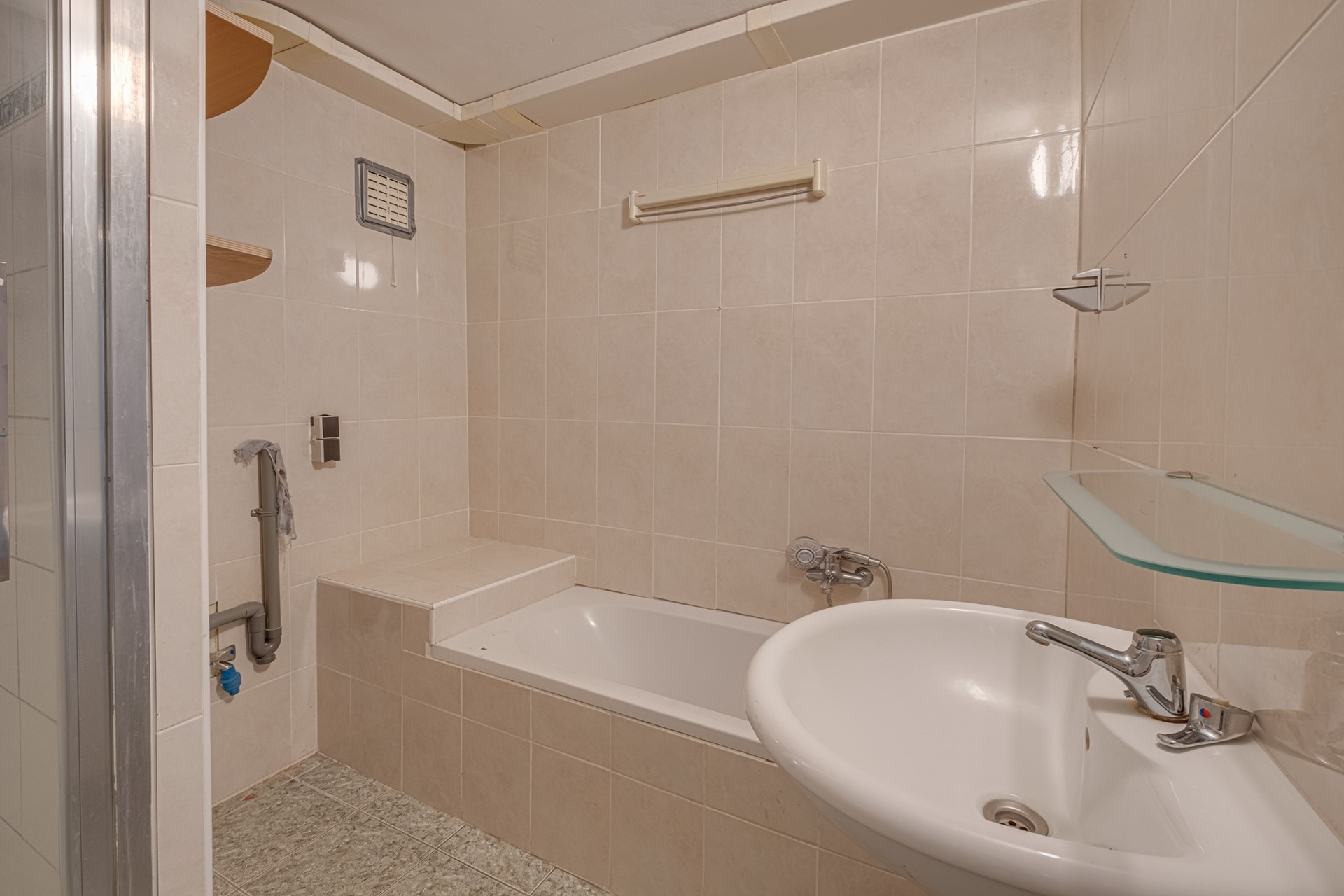 In het appartement zijn er tenslotte nog de badkamer en het toilet. De badkamer is geheel betegeld en uitgerust met een douche, ligbad en wastafel. Ook het toilet is geheel betegeld.