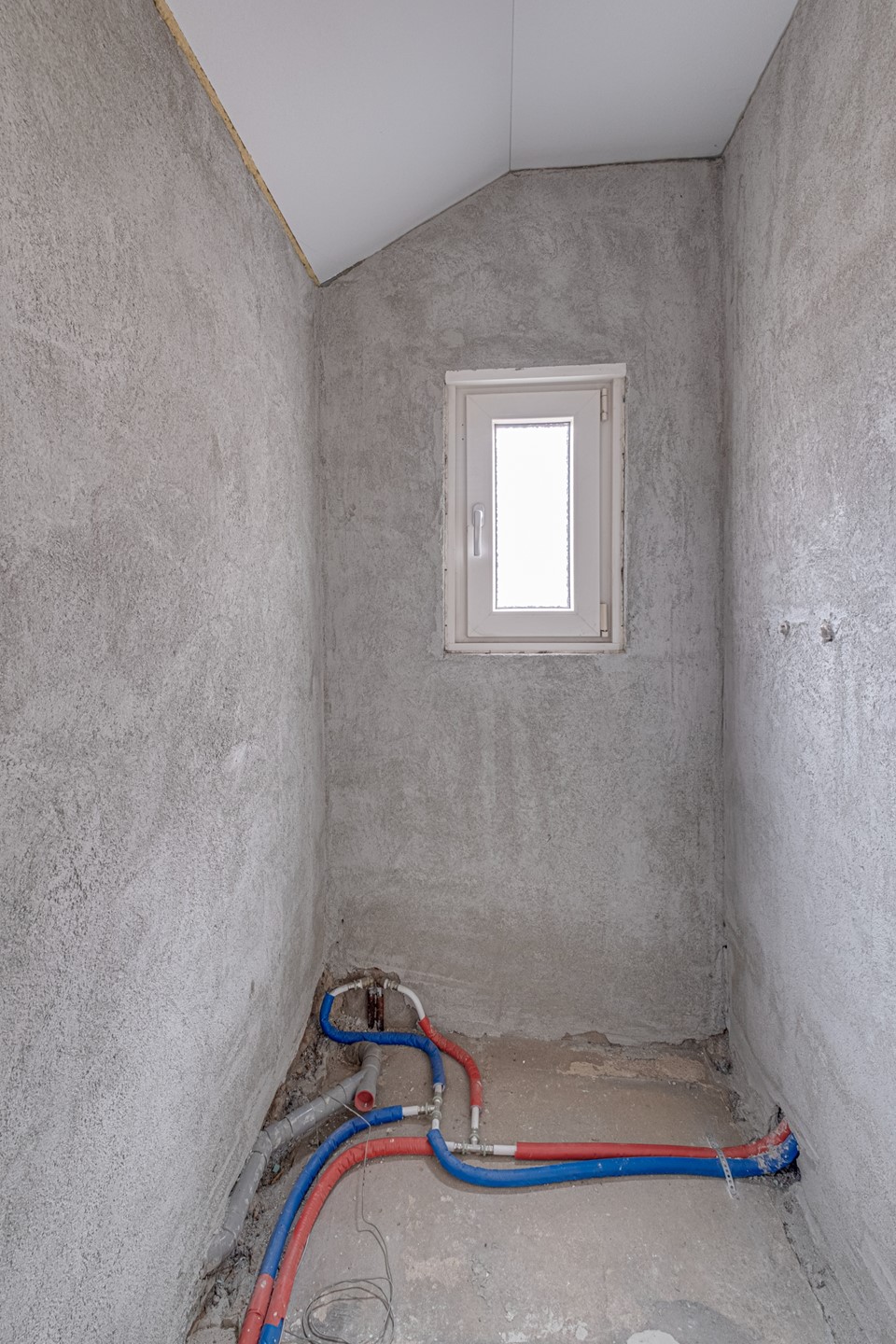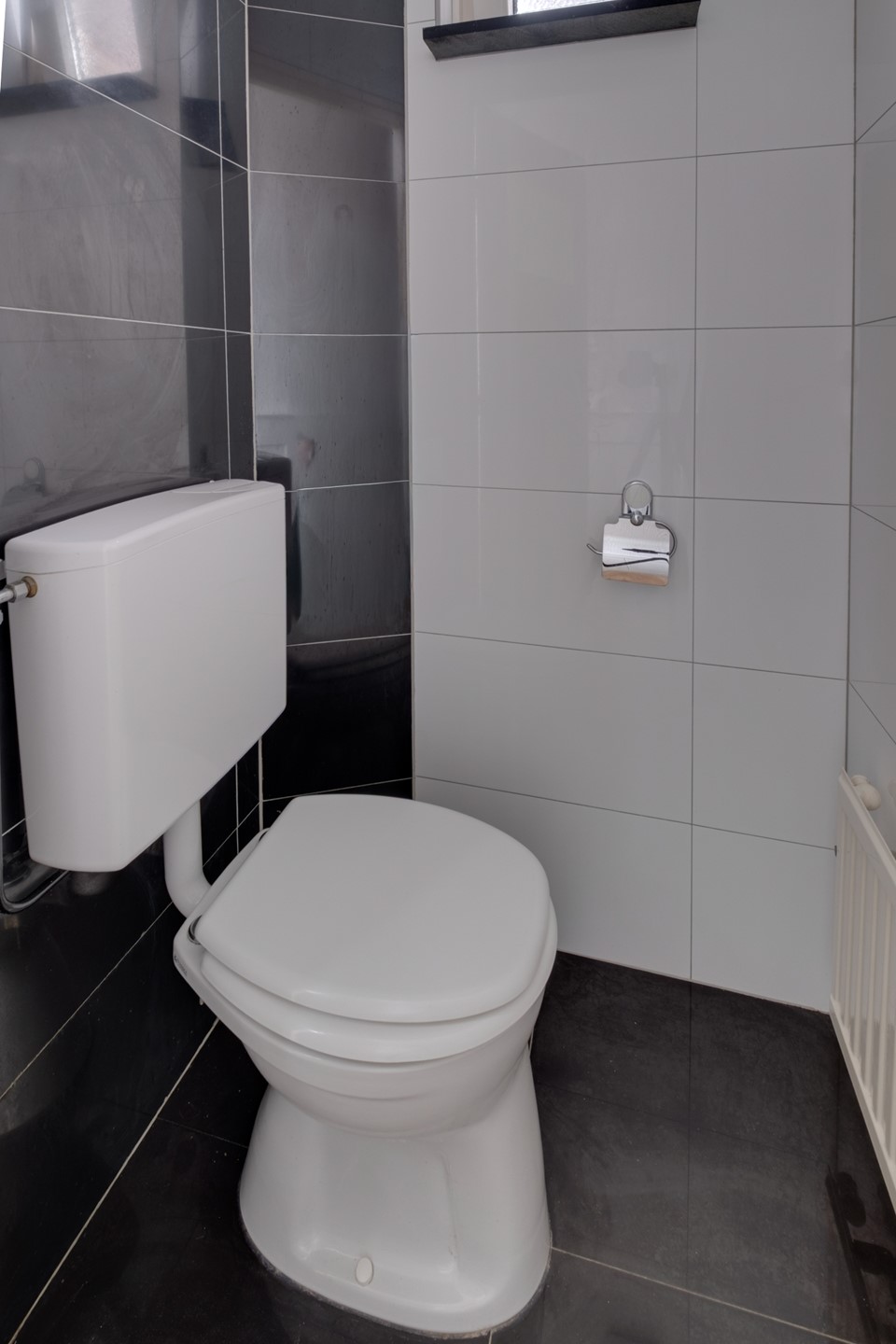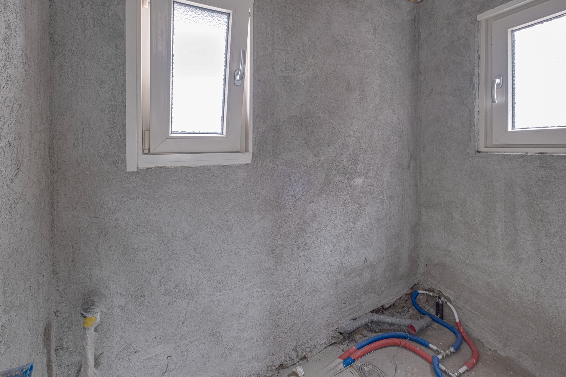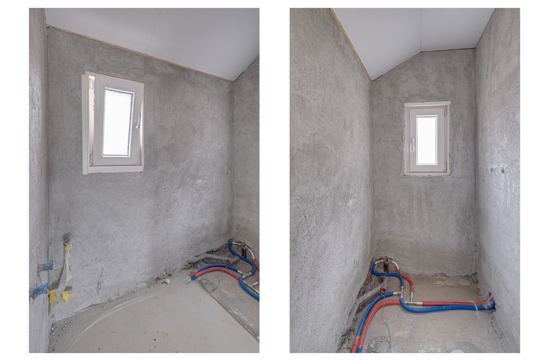 Naast de keuken is een badkamer gerealiseerd. De badkamer beschikt over een douche, een hoekbad en een badkamermeubel met wasbak. Ook bevindt zich naast de keuken een gang naar de buitendeur aan de zijkant van de woning. In deze gang is de CV-ketel geplaats en zijn er aansluitmogelijkheden voor witgoed. In deze ruimte bevindt zich ook de toegang tot de kruipruimte.