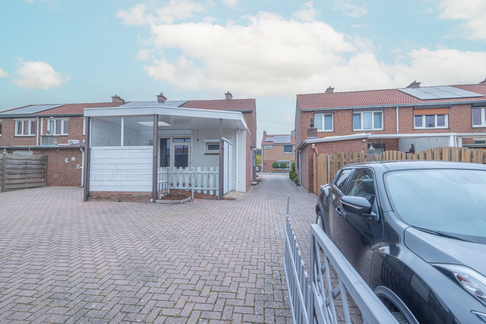 De buitendeur aan de achterzijde van de keuken geeft toegang tot het overdekte terras en het gezamenlijke erf vóór de garage en berging.