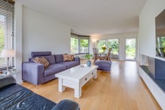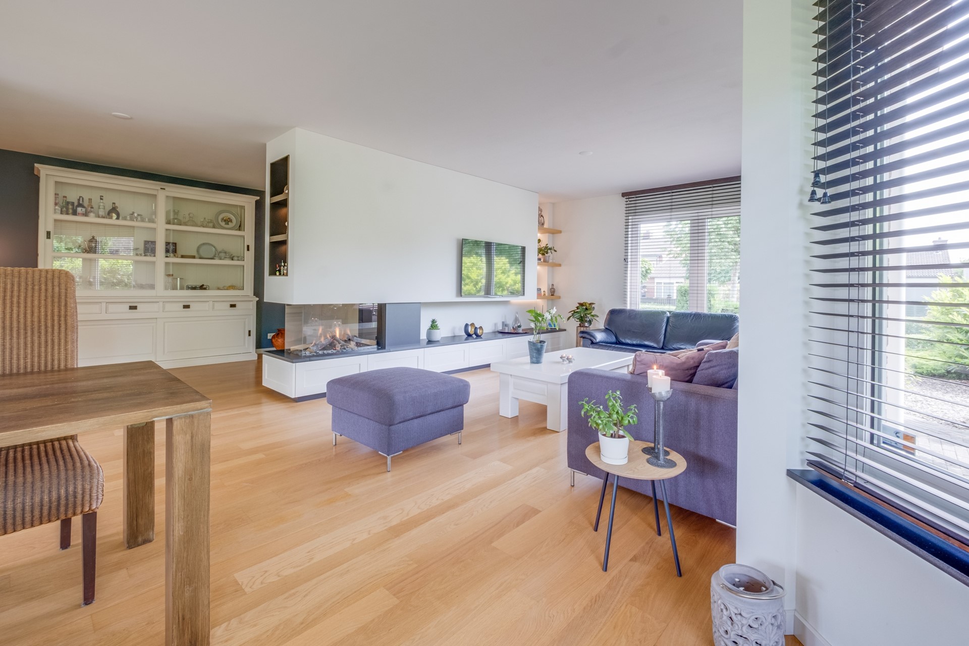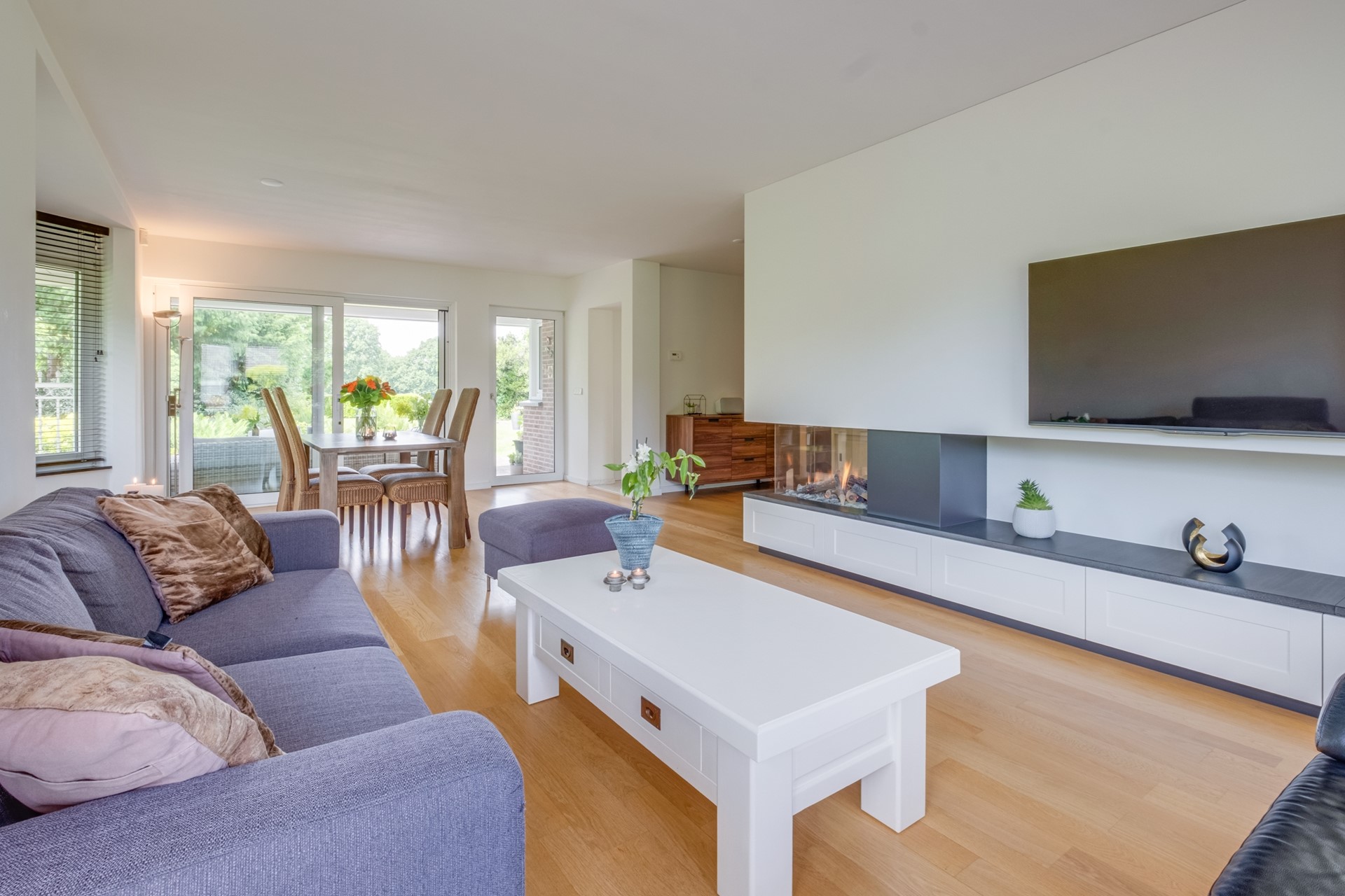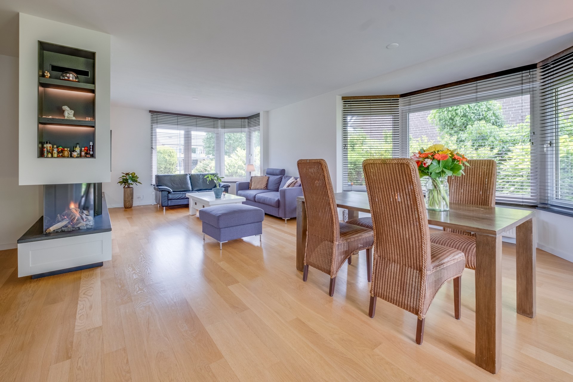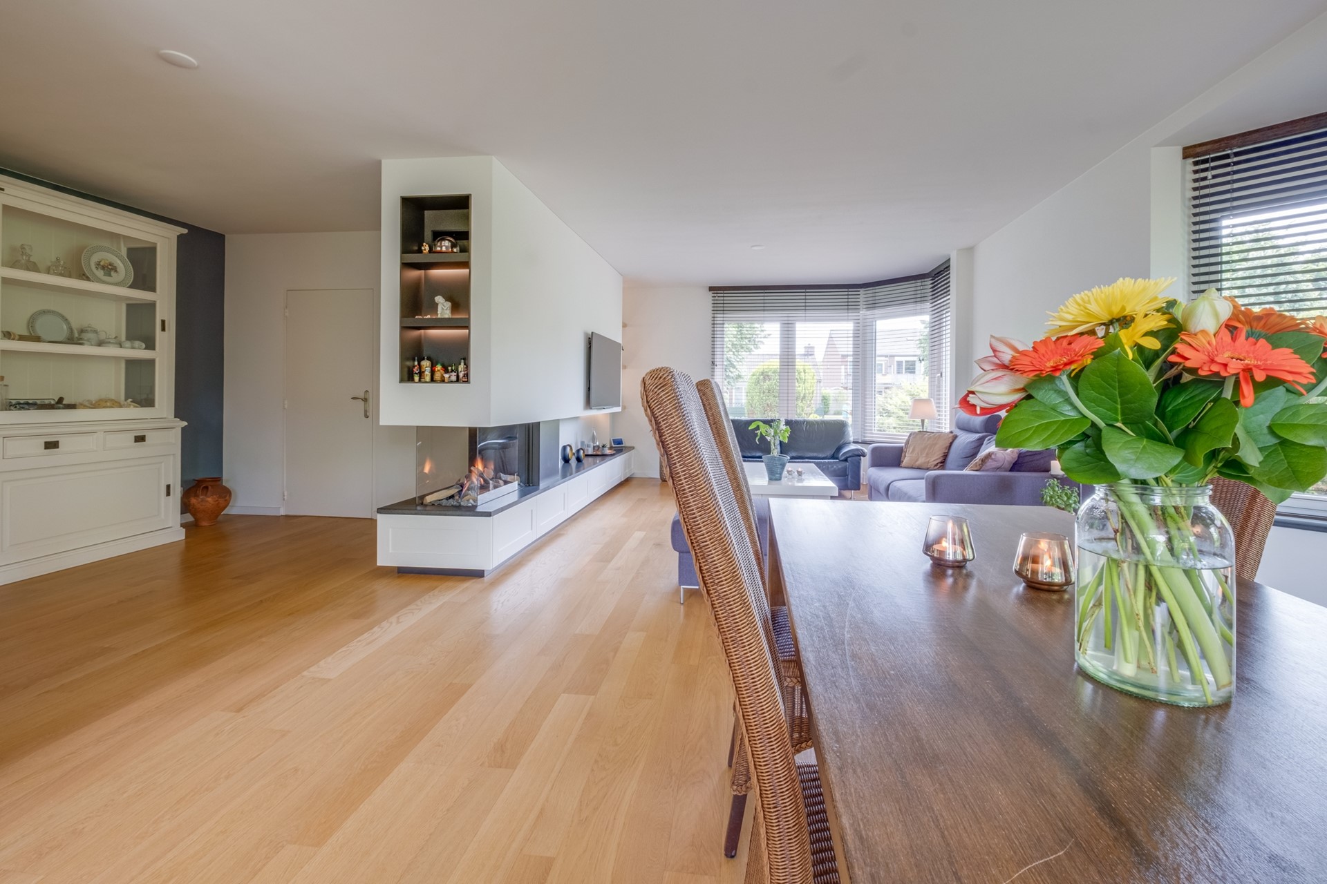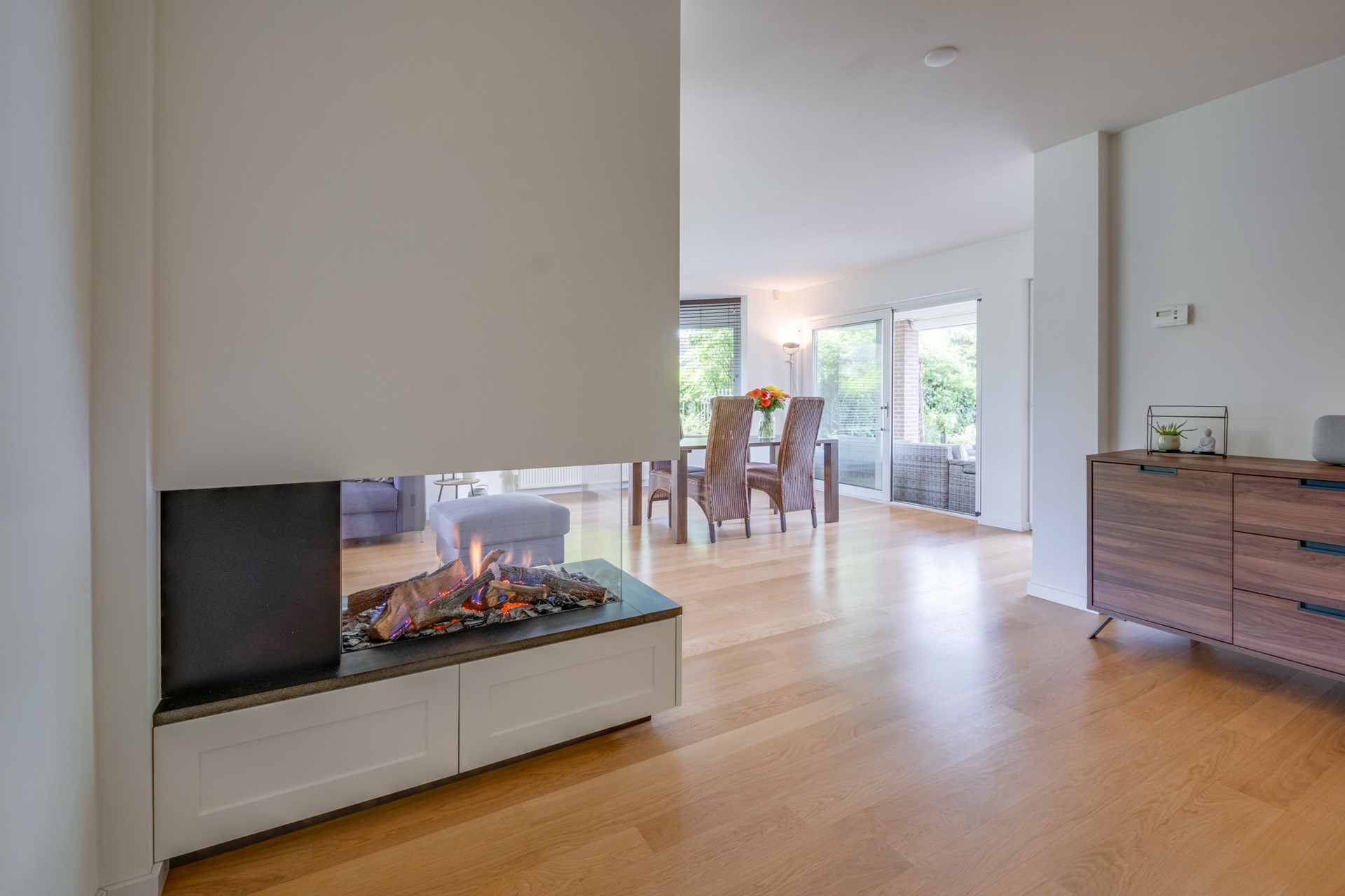 De ruime woonkamer is voorzien van een fraaie parketvloer en wordt op een elegante wijze onderbroken door een sfeervolle, ingebouwde gashaard. Aan de achterkant van de kamer is een grote schuifpui die toegang geeft tot het overdekte terras en de tuin.