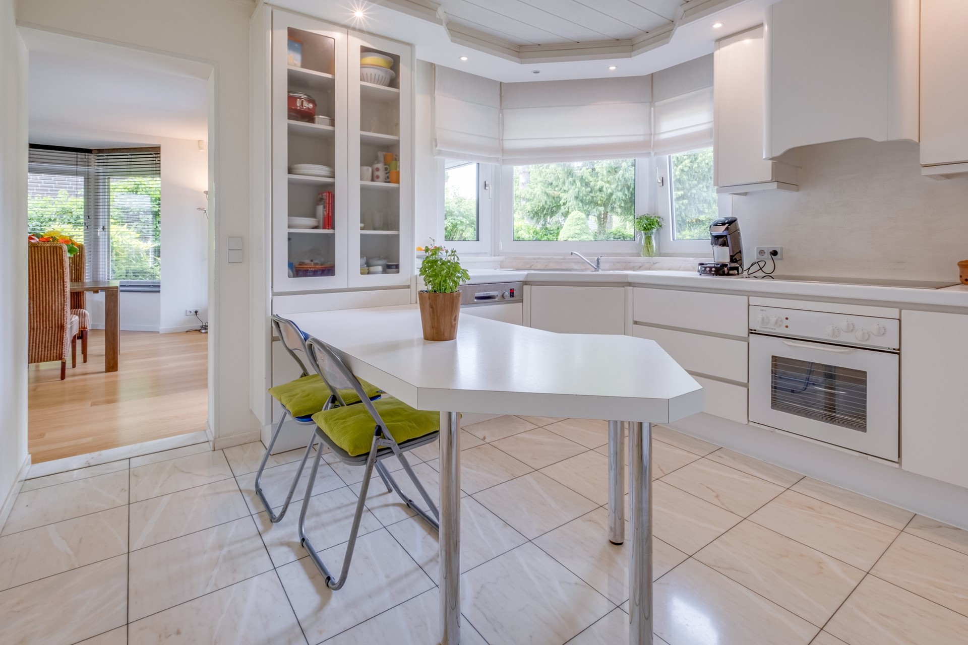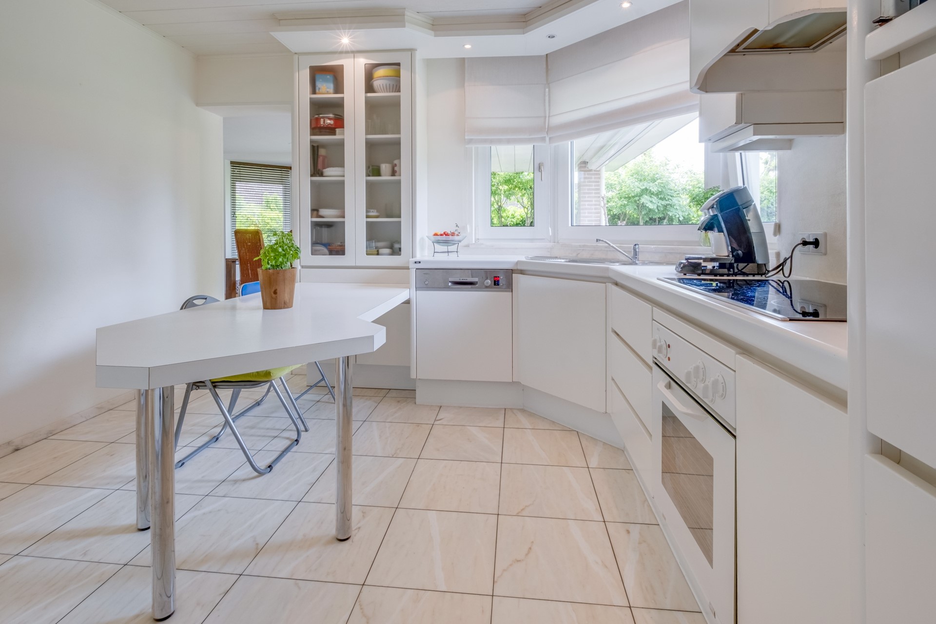De keuken heeft een tegelvoer en het keukenblok bestaat uit een hoekopstelling met eettafel als schiereiland aan de keuken vast. Het keukenblok is uitgerust met de gebruikelijke inbouwapparatuur. Vanuit de keuken is er uitzicht over de mooie tuin en het daarachter gelegen weiland.