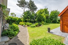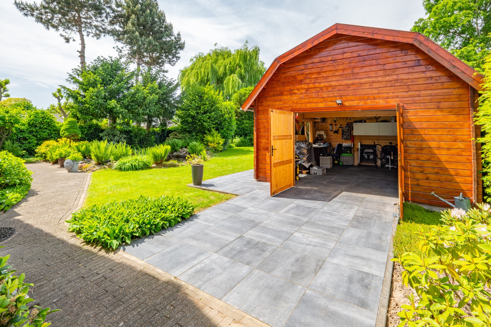 In de royale achtertuin staat een vrijstaande houten garage met vliering. De garage beschikt over elektriciteit en is voorzien van een tegelvloer.