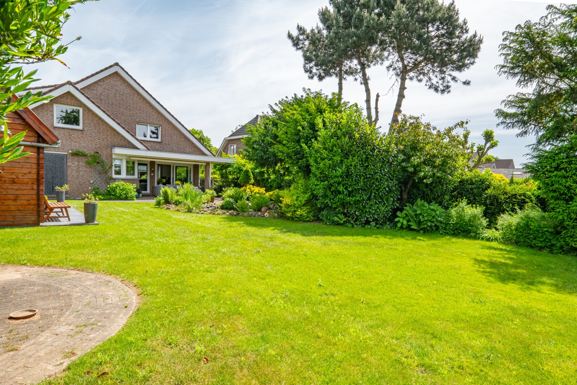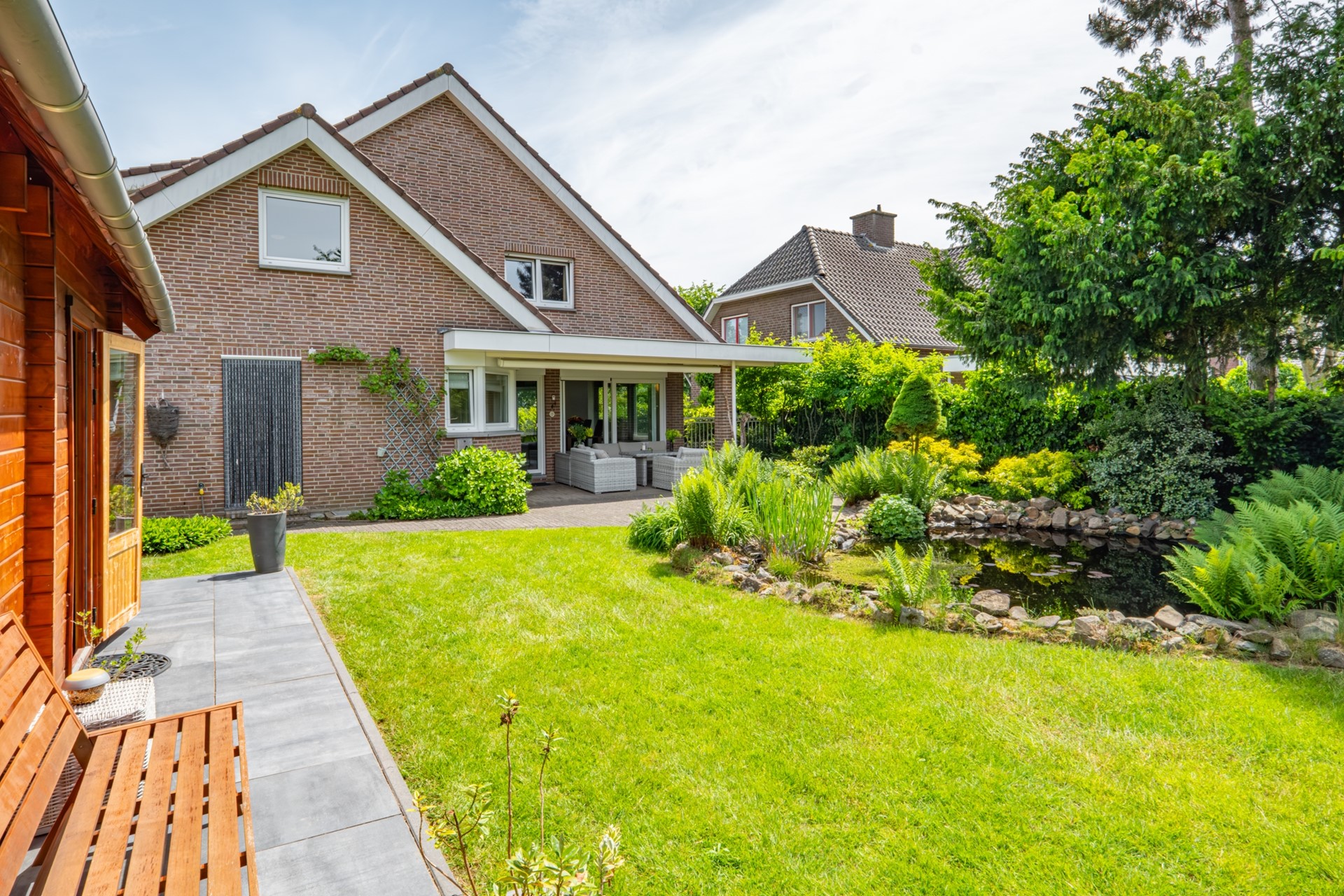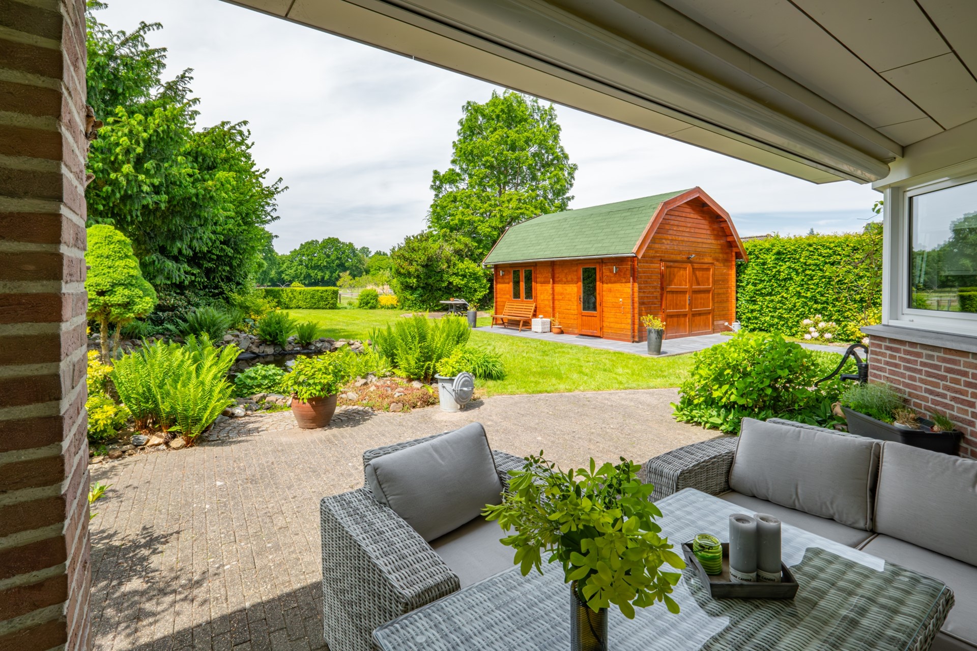 De tuin, met veel privacy en vrij uitzicht over het weiland daarachter, bestaat uit een groot gazon, een mooie vijver, diverse borders met bloemen en planten en een overdekt terras waarop je onder het 4,5 meter brede zonnescherm lekker kunt genieten van een drankje.