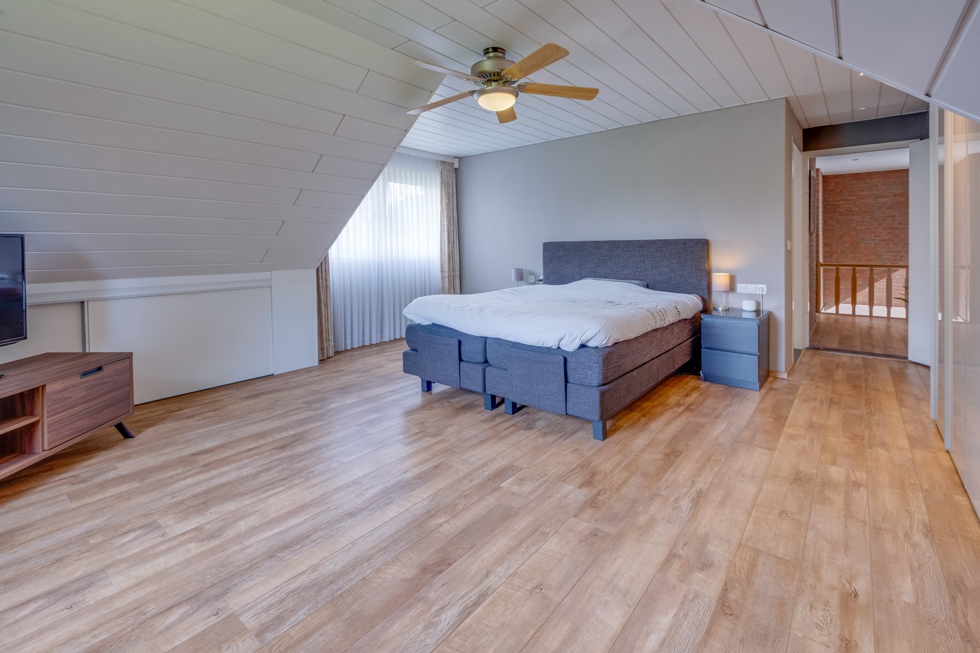 De master-bedroom ligt aan de achterzijde, heeft een badkamer ensuite en is ruim 27 m² groot. De ruime badkamer ensuite is uitgerust met een inloopdouche, ligbad en een dubbele wastafel.