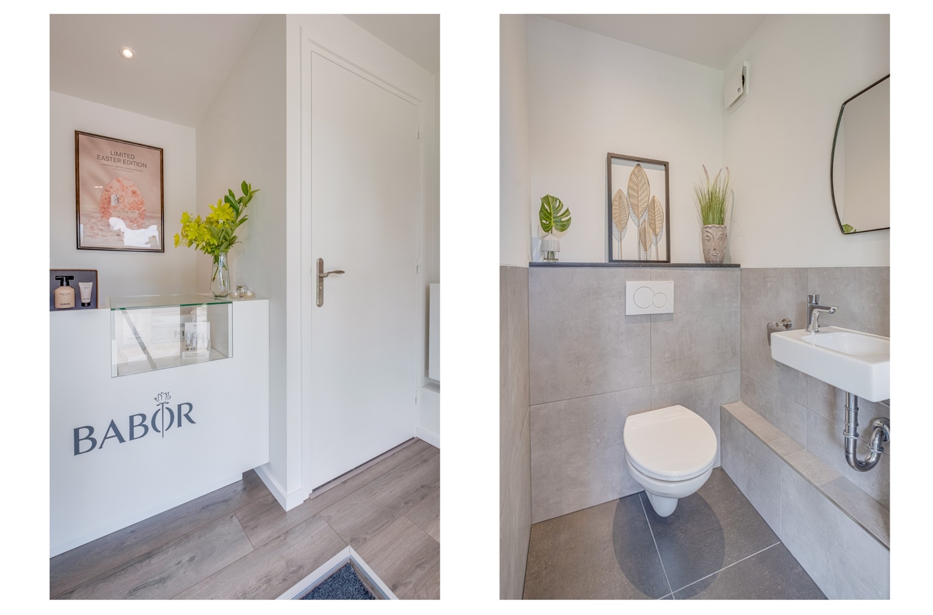 De stijlvolle afwerking en mooie details zorgen voor een elegant en warm interieur, terwijl de grote werk- of praktijkruimte ideaal is voor ondernemers die een veelzijdige werkplek aan huis zoeken.